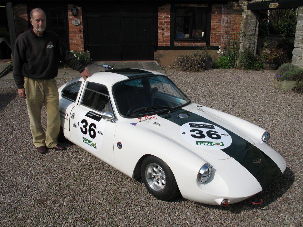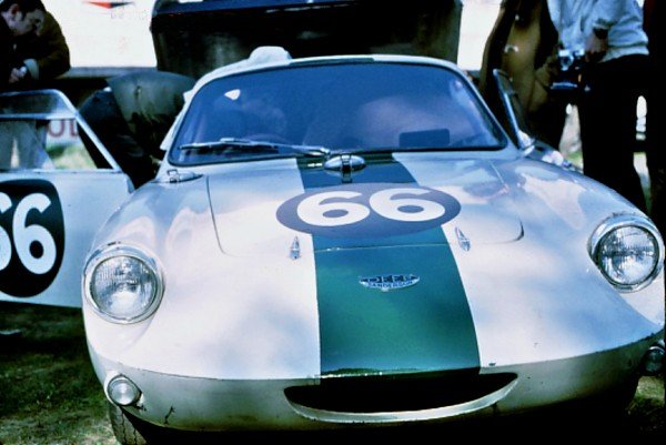 Middle left: Quite different from the prototype, the production Deep Sanderson 301 is seen at Le Mans in 1963. Middle right: Le Mans in 1963 - as the caption says, Chris Lawrence drove this 998cc 301 with Chris Spender. The car went off the track after 15 hours and failed to qualify. Lawrence entered a similar car, but with a 1293cc engine in the 1964 race, but this time co-driven by Gordon Spice. They retired after three hours with the engine overheating, a problem not uncommon with rear-mounted Mini units. Bottom: This is the 1963 Le Mans car (no 66) which was totally rebuilt by Chris Lawrence (left) to compete in the Le Mans Classic meeting in 2004 (right). |