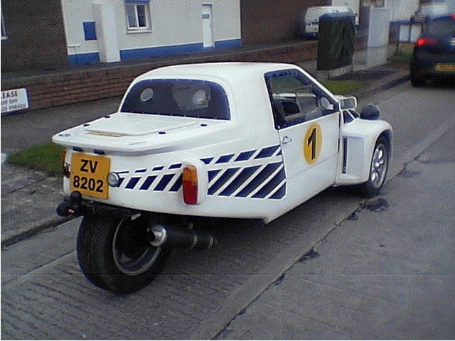 | This was seen for auction in Dublin. The seller says “This is a one off 3 wheel kit car built by Graham Hull in 1991 and featured in Total Kit Car magazine. It has excellent road handling and completely reliable, having recently completeted a round Ireland trip of 1000 miles. The car is tax exempt as it is 1972 registered based on the donor car. The chassis is a simple ladder frame of square steel with a Mini subframe. The back end is a much modified, non steering, Reliant front suspension reversed. The exterior is made from woven kevlar and fibreglass.” |