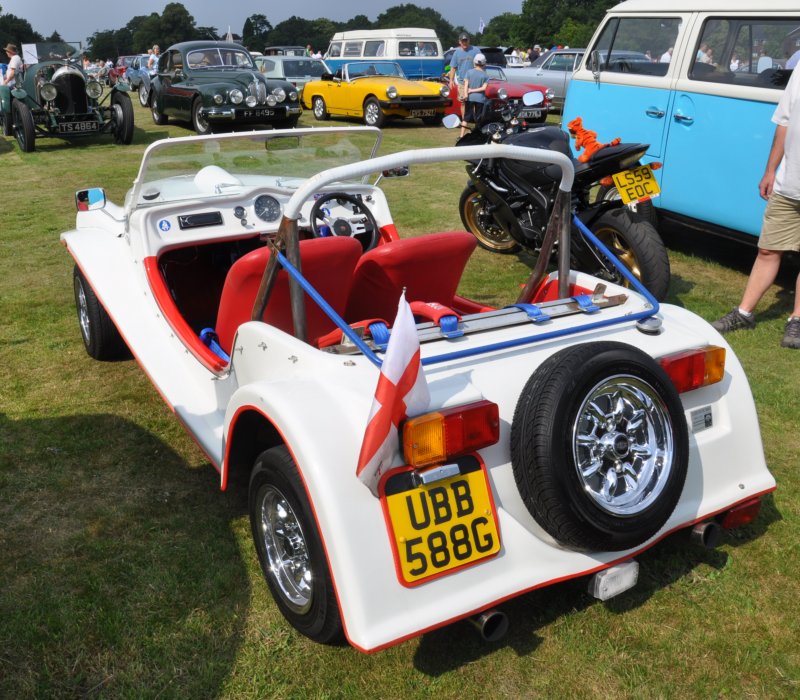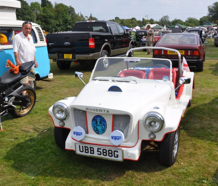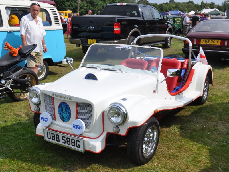 | Magentas were made is a former engine shed at Lealholme station on the Esk Valley Line in North Yorkshire. Most were based on the BMC 1100/1300 range and were designed to take the MG grille. This is one of the Mini-based models and was seen at Classics on the Green at Croxley Green in 2011. (Photo © 2011 Richard Porter) |