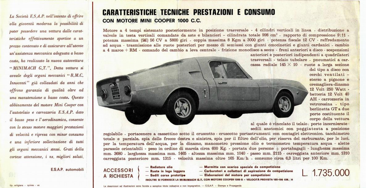 Minimach GTAn interesting discovery at the 2003 International Mini Meeting at Pomposa was this article and brochure of the Minimach GT which was produced in Venice. It is based on an Innocenti Cooper and clearly influenced by the Unipower GT. The magazine is dated 7th March, 1968. The scans were kindly provided by Francesco Panella of Red & White Mini Time More pictures (text in Italian) <back | alternatives | next> |