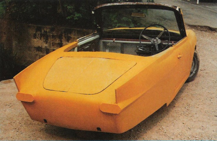 wings, Riley 1500 bonnet, Renault 5 screen and frame, Mini doors, rear end was Volvo 1800 with 18" cut out of it, and the