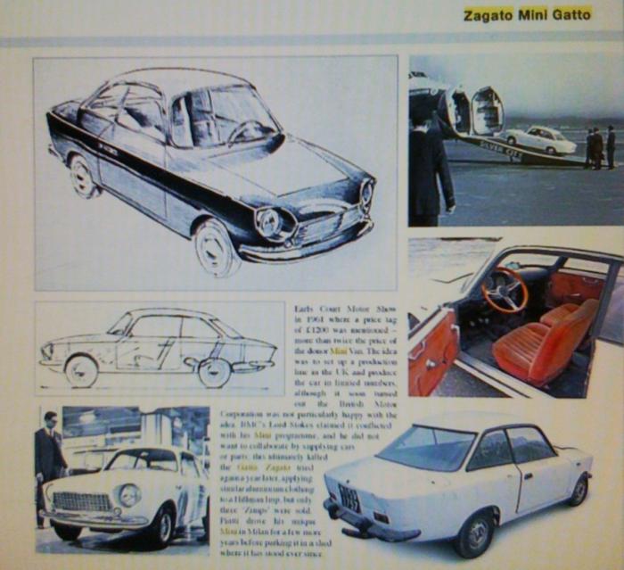 | This Mini Coupe by Zagato is a one-off prototype. The aluminum body was designed by Ercole Spada on the Mini Van floor pan. It was displayed at the London Motor Show at Earls Court in 1961. Zagato intended to build a run of 30 but this never happened. The top two images are factory publicity photos. See also this cutting. |