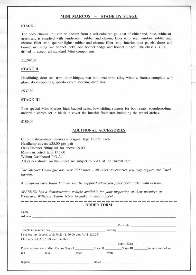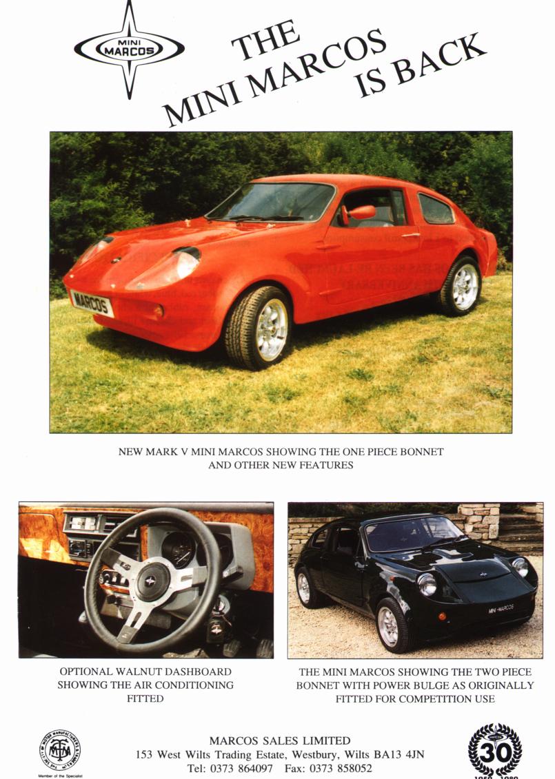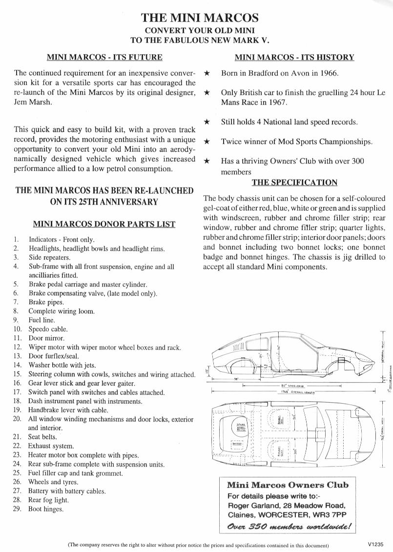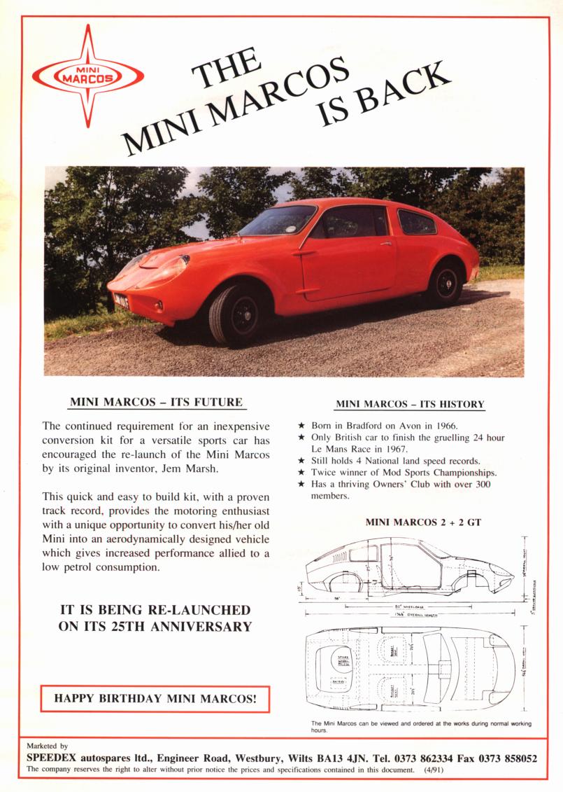 The Mini Marcos Is BackTwo early sales sheets for the Mk. V Mini Marcos.The upper pictures show the relaunch leaflet for the Mini Marcos in 1991. Produced in advance of the launch of the Mk. V Mini Marcos, the leaflet shows a Mk.IV car. Notice that the car was then being marketed by Jem Marsh's parts and accessories company, Speedex Autospares Limited. The lower pictures show the redesigned leaflet with the Mk. V car pictured, complete with tail spoiler. The plan and elevation drawings which have appeared on all the Mini Marcos brochures and leaflets are for the original Mk. I car, including the dimensions. The car was by then being marketed by Marcos Sales Limited. The Mini Marcos Owners Club details appear on the back of the sheet. The reference to the 1967 Le Mans race is an error as the Mini Marcos finished the 1966 race but retired in 1967. The link on each page displays a larger image (104 to 155 kbytes).
