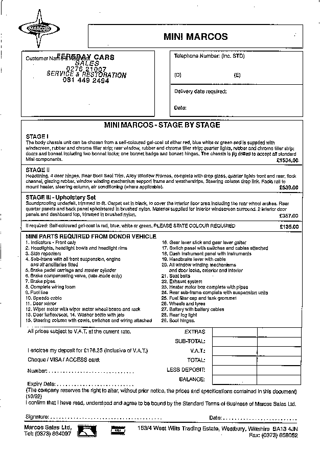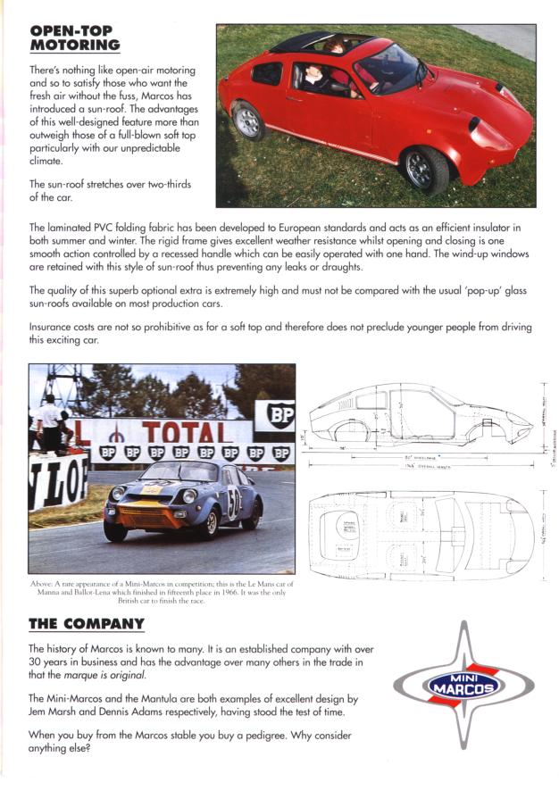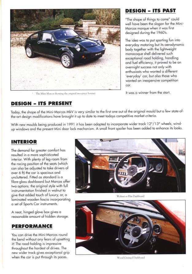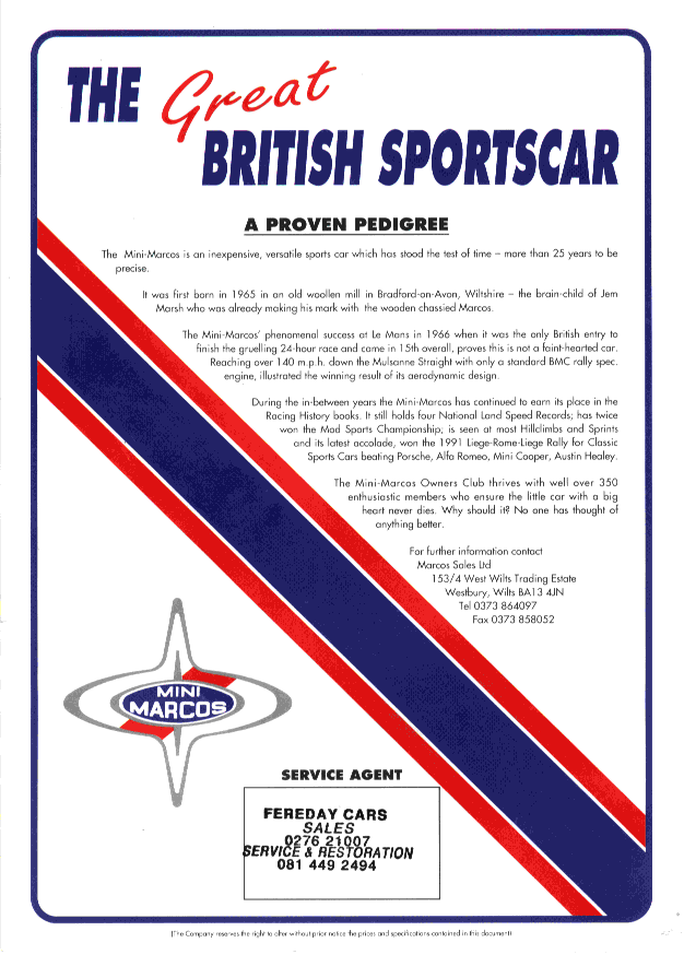 Sales brochure for the Mk. V Mini Marcos, courtesy of Fereday Cars. The link on each page displays a larger image (40 to 106 kbytes).