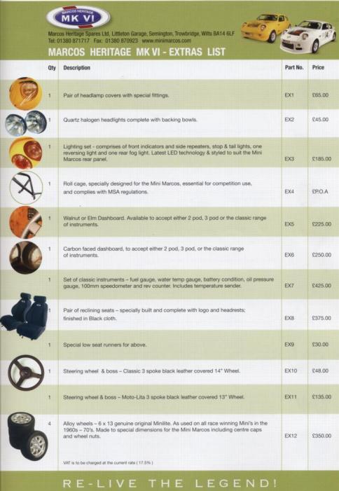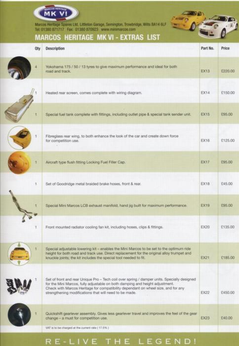 Follow link on price extract below for full order form (112 kbytes). If you wish to order either of the Mini marcos kits please contact Marcos Heritage Spares Ltd. directly. There are terms and conditions of sale which are not reproduced on this site. Please mention this site if you heard about the new kits here. The basic price for the Mk. VI has now been increased to £3,800. Stage II and III prices remain the same. |