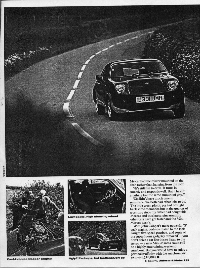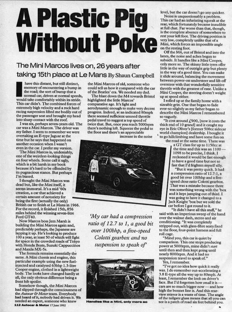 Shaun Campbell drives the Mini Marcos Mk.V (from a photocopy).