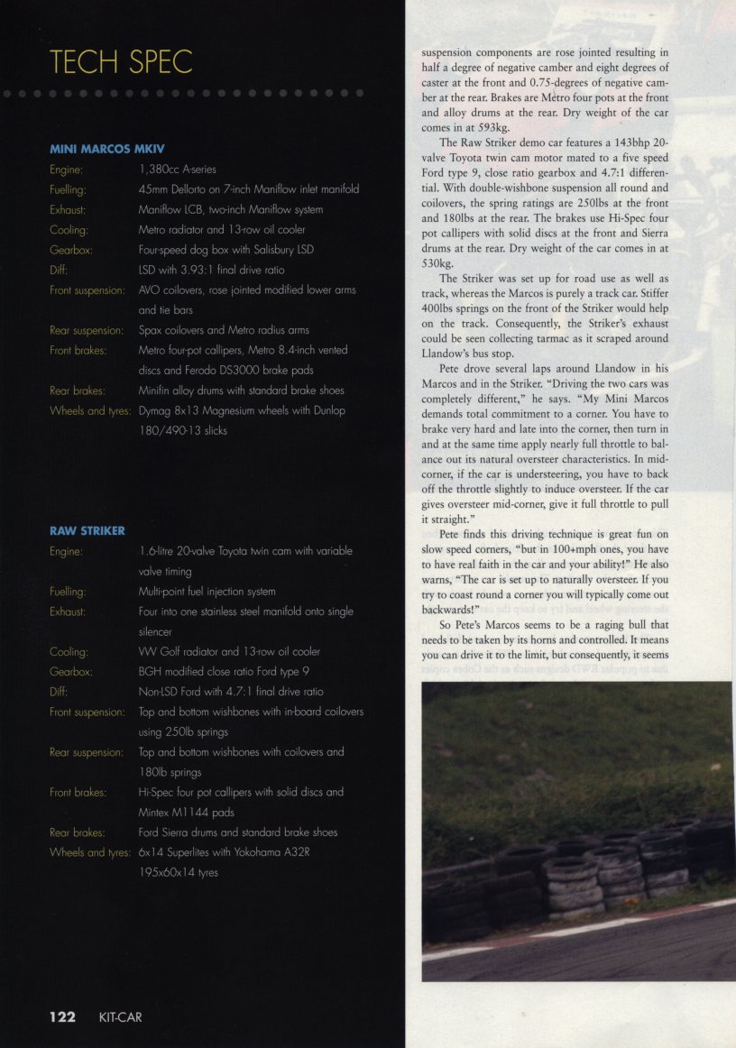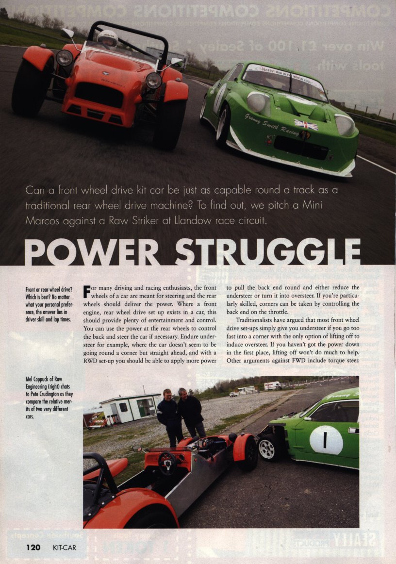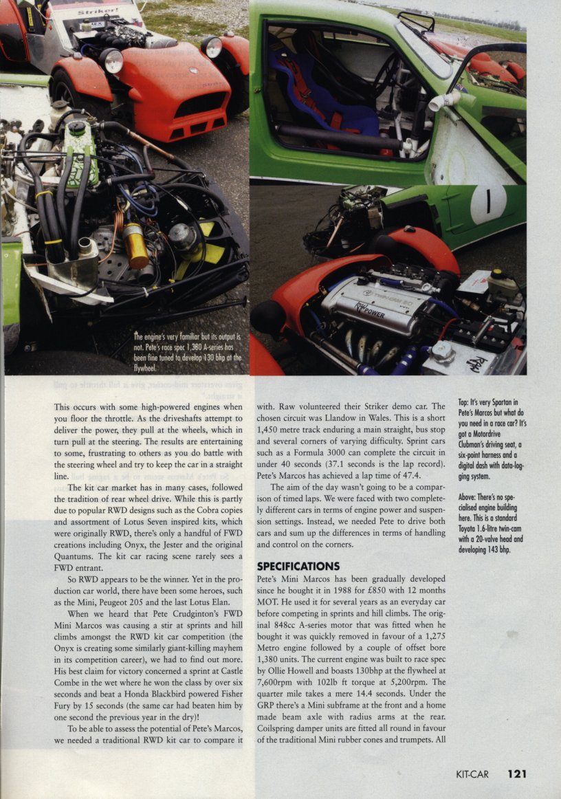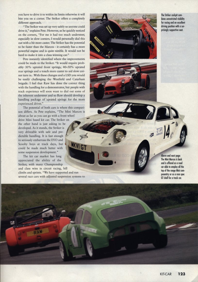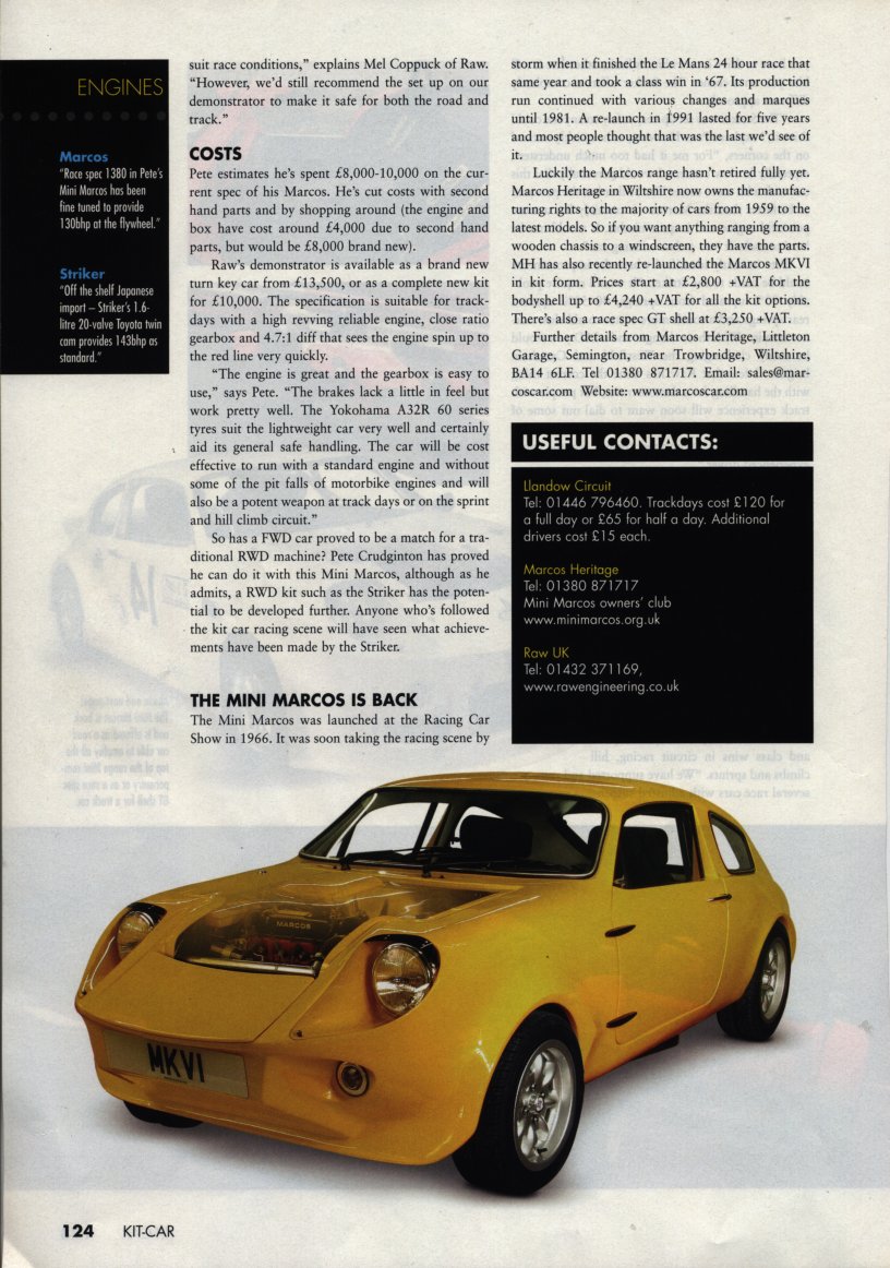 Kit-Car Magazine, July 2005 Power Struggle Pete Crudgington’s Mini Marcos Mk.IV vs a Raw Striker, plus news of the new Marcos Heritage Mk.VI. Kit Car Magazine Kit Car index | Cuttings Last updated 21st February, 2013