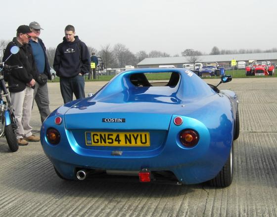 A far cry from the "Ugly Duckling" Marcos, this is the last project that Frank Costin worked on before his death. Chris Holloway's Costin was seen at the European Kit Car Show at Detling on 2nd April 2005. The car was jointly designed by Frank Costin, Bill Barranco of I.A.D at the time and Simon Garrett. It was due for launch in 1993, but a combination of Frank falling ill, and strangely the Yen/Stirling crisis put it on hold. It uses Vauxhall Chevette front stubs and rack, and Metro front stubs on the rear bolted to a de Dion tube, all bolted to a lightweight spaceframe chassis. The engine is K Series. The car pictured is the prototype GRP car. One other shell and the moulds are now owned by Joe Tavani who kindly supplied the information above. Simon Garrett still has another prototype with an aluminium body and Mini power unit nicknamed "the dustbin". (Photos © 2005 R. Porter) |