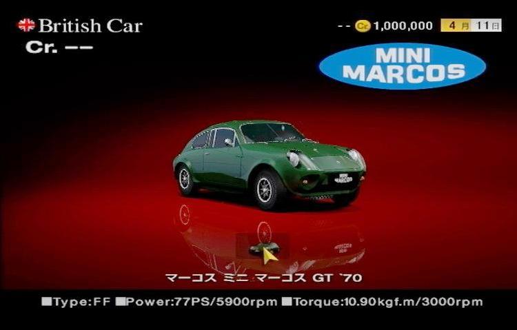 The Marcos Mini GT 1970 is one of the cars you can drive in the Gran Turismo 4 video simulation game.