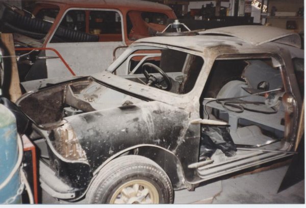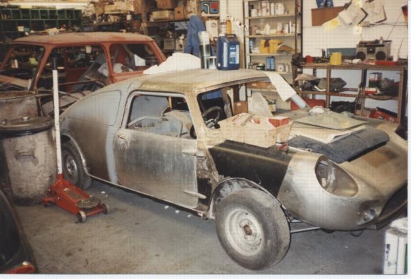 The company had purchased the DART from Furber's Scrap Yard in Leicester. Furber's called up one day and said "We've got this really weird GT Mini, come and have a look". The car was painted red with a maroon velvet interior and Triumph Spitfire seats, needless to say it was a mess! The bonnet was adapted from a Morris Minor. The car had been owned by a student in Leicester. She had been given the car years ago, she knew nothing of its history and viewed it as a customised GT! It was committed to the scrapyard because it was not cost effective to make roadworthy. The restoration company purchased it for 250 pounds and after a year of sitting gathering dust is now in the midst of a 7000 pound restoration. Sadly, it is ultimately heading for a museum in Japan. The restoration is missing a few key features, such as door gutters. This is mainly due to the fact that not much of the original metal remains and no one really has too much to go on! Only the roof and part of the floor are truly DART.