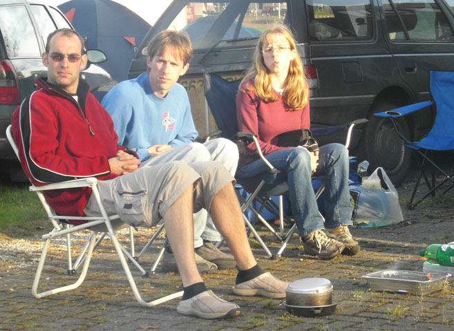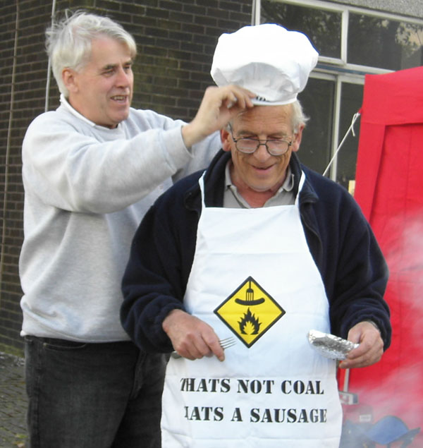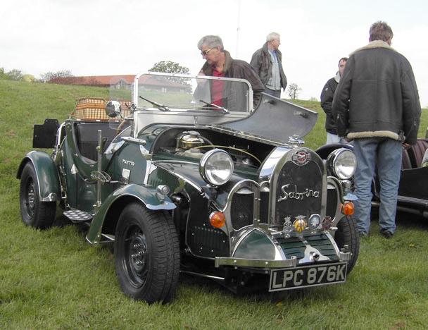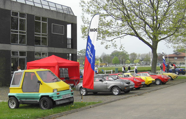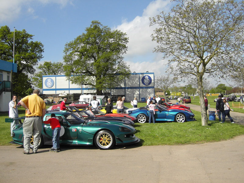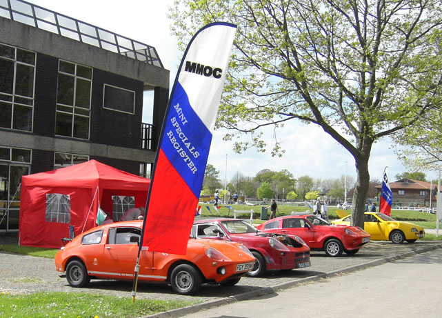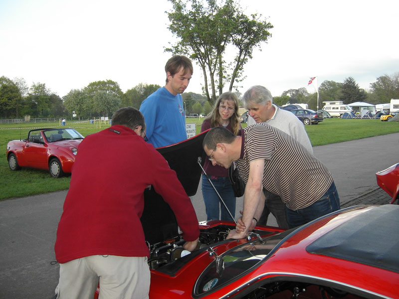 3: Club stand on Sunday. Two other Mini Marcoses were present. 4, 5:BBQ Boss Mike Perkins (and it was all Roger's doing). 6: Five heads are better than one (but not a lot) - Howard Plant's Mini Marcos engine proved a little difficult to coax into life. 7: I think I've been spotted here! 8: The big Marcoses arrived in convoy on Monday having spent Sunday at Rockingham. 9, 10: A one-off (thankfully) Mini engined special called Sabrina. 11, 12: The Z-cars bike-engined, spaceframe, Mini profile racer. 13: The coating is supposed to reflect flash, but it's not much protection from digital cameras! 14: A somewhat depleted club stand on Monday. (Photos © 2005 Richard Porter) |