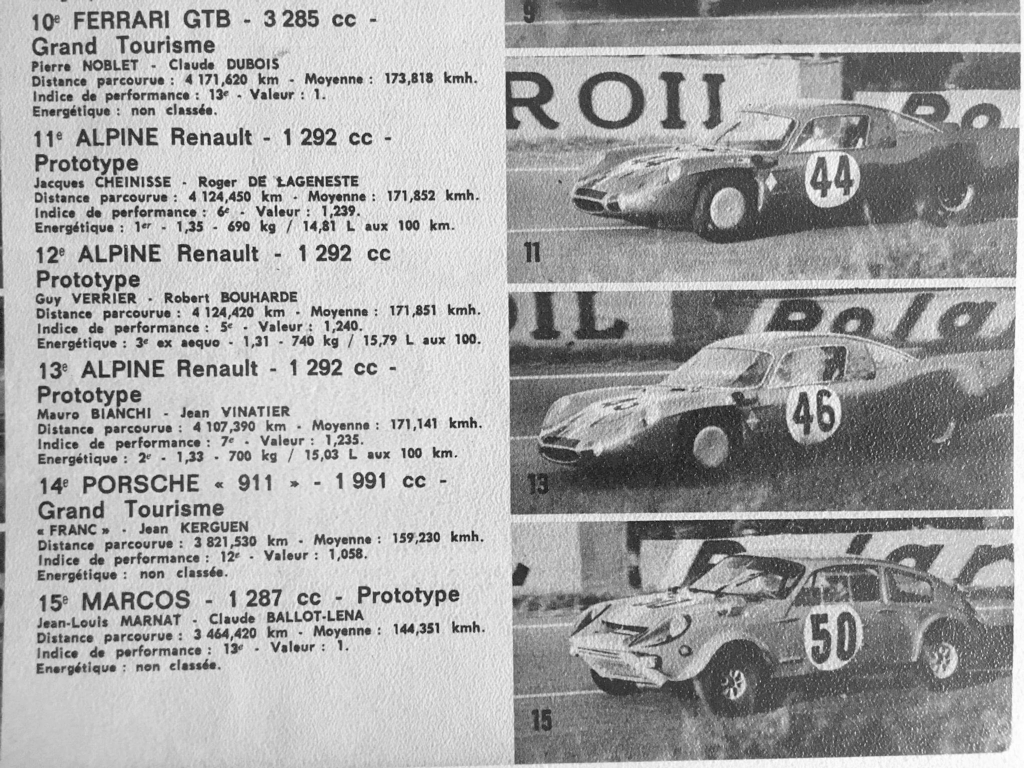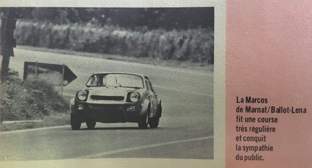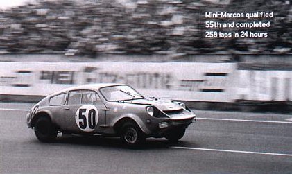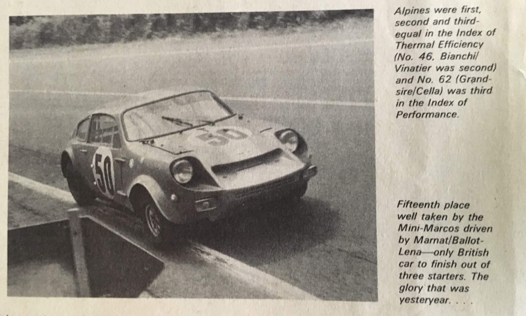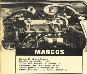 The Mini Marcos Mk.I (MM 6102) of Claude Ballot-Léna and Jean-Louis Marnat finished the race in 15th and last place but was the only British car to qualify as a finisher in 1966. The engine was a Monte-Carlo Rally spec. 1275 Mini Cooper 'S' unit ordered off the shelf from the BMC Competitions Department who had no idea what it was going to be used for!