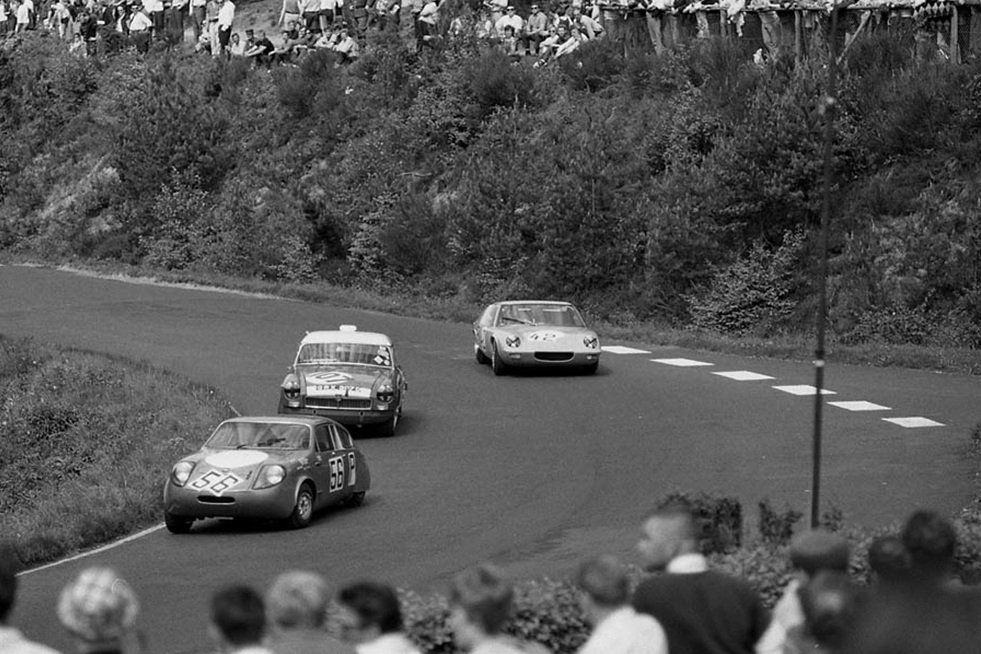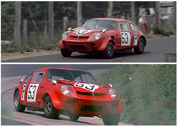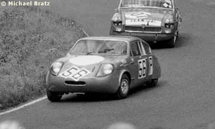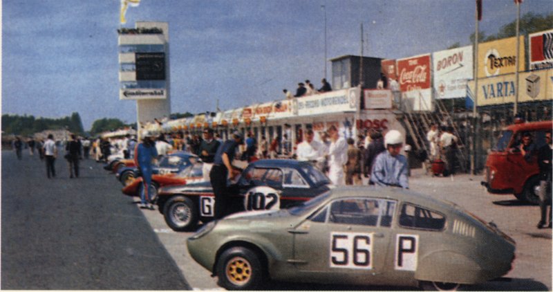 Car 55: The streamlined Mini Marcos driven by F.L.I.R.T. girls Joey Cook (centre) and Jackie Bond-Smith (right) who retired with an engine failure after 24 laps. (Werner Ullrich, Andrew Griffiths) Car 56: The streamlined Mini Marcos of Mike Garton (GB) and Patrick McNally (AUS) which finished 18th overall, first in class and only 8 laps behind the winning Porsche 910. Centre: No. 56 leads the Julien Vernaeve/Clive Baker MGB and Chris Barber’s Lotus 47 which was driven by Keith Greene and John Hine. (R: Werner Ullrich, M. Bratz) |